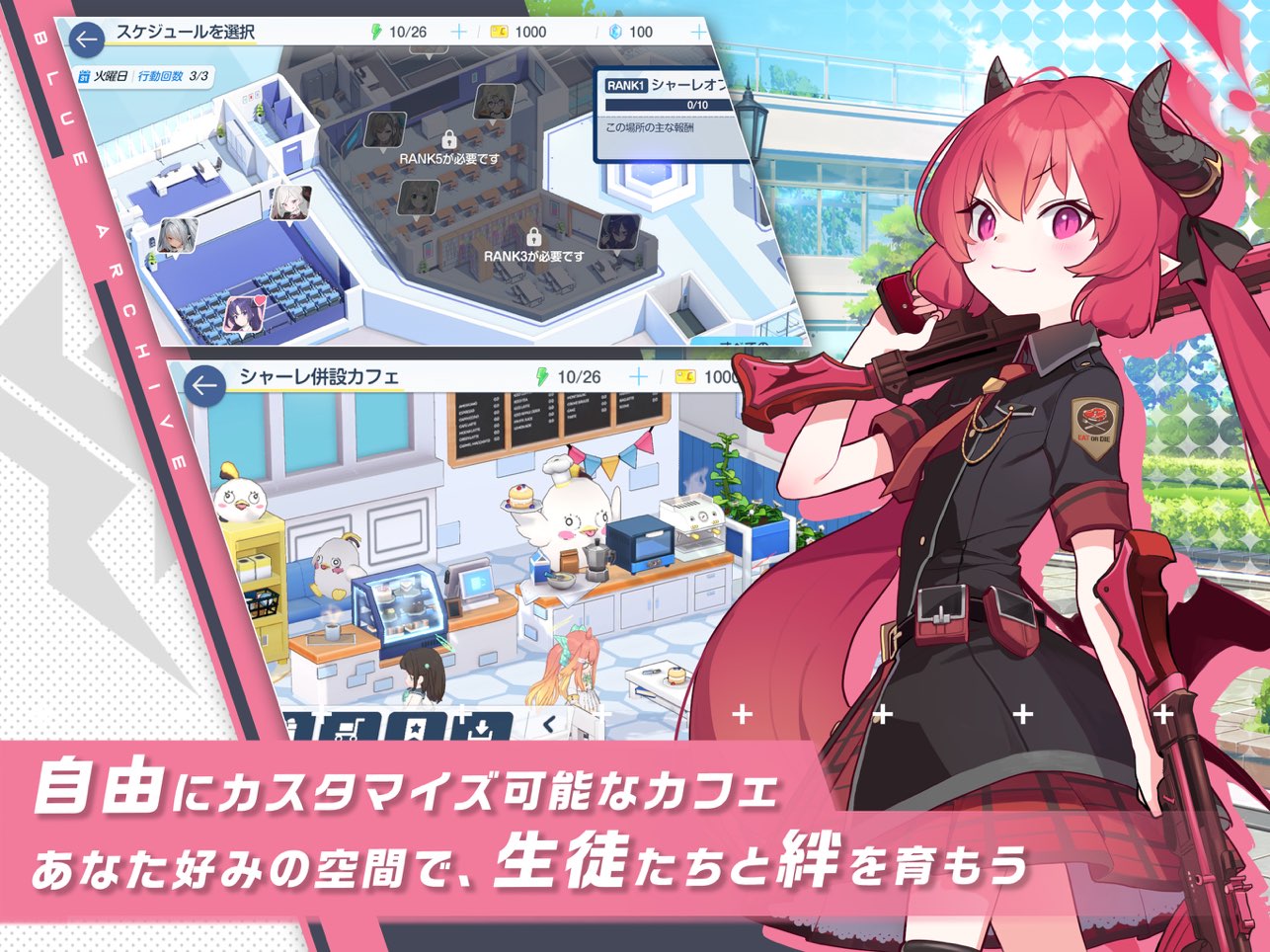 好感度的提升途径主要是课程表与咖啡厅,随着收录的学生种类越多,课程表前往的区域也会扩增,完成课程表可提升与学生的羁绊值、或者是在咖啡厅解锁后以送礼的方式提升羁绊值,咖啡馆与课程表的学生种类将会定时更换,但只有咖啡厅有额外一次可邀请特定学生前来的机会,对于喜爱的学生就努力培养羁绊等级,好处多多。