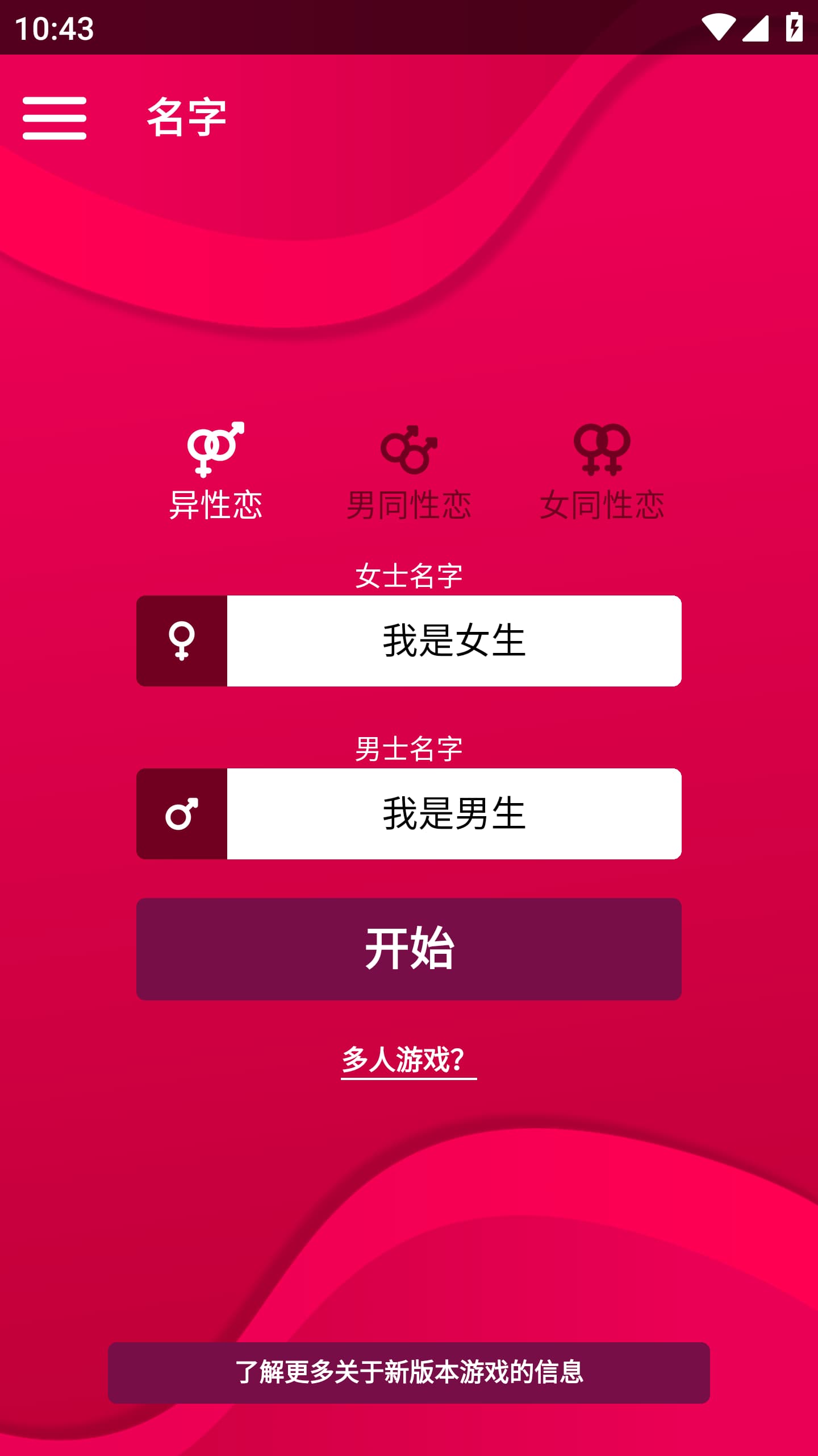 1、下载安装couple game游戏,先选择自己的性取向,输入情侣双方的名字,可以自定义,然后点击“开始”。