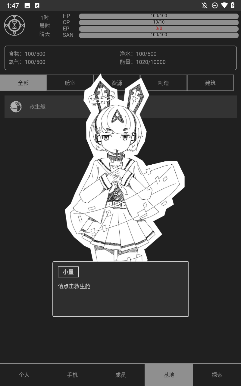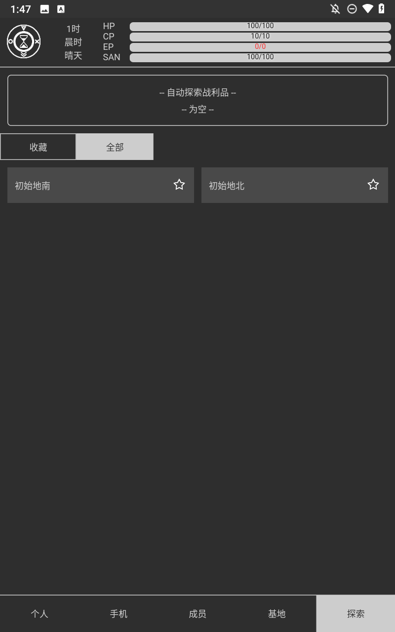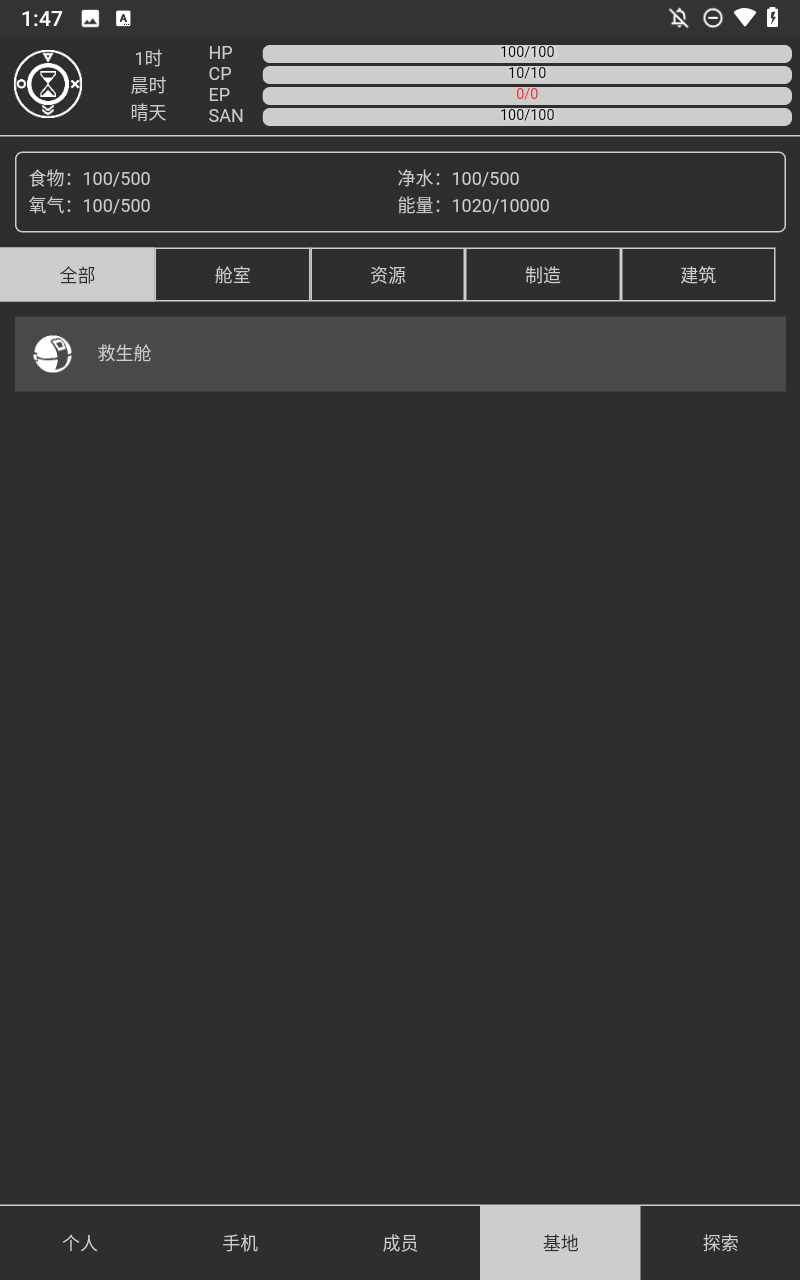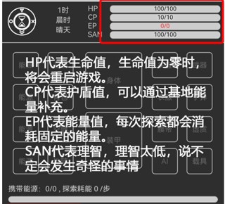 3、HP代表生命值,生命值为零时,将会重启游戏;CP代表护盾值,可以通过基地能量补充;EP代表能量值,每次探索都会消耗固定的能量;SAN代表理智,理智太低,说不定会发生奇怪的事情