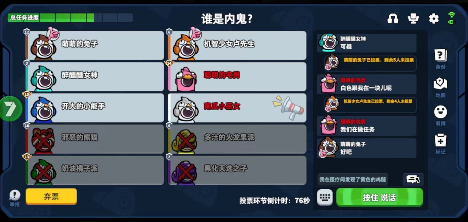 除此之外,内鬼要做的是杀光船员(或者内鬼多过船员就行了)对了,内鬼也有投票权,所以请小心。