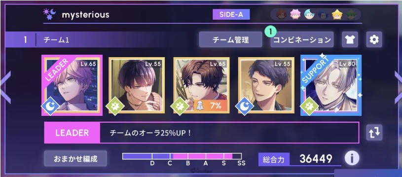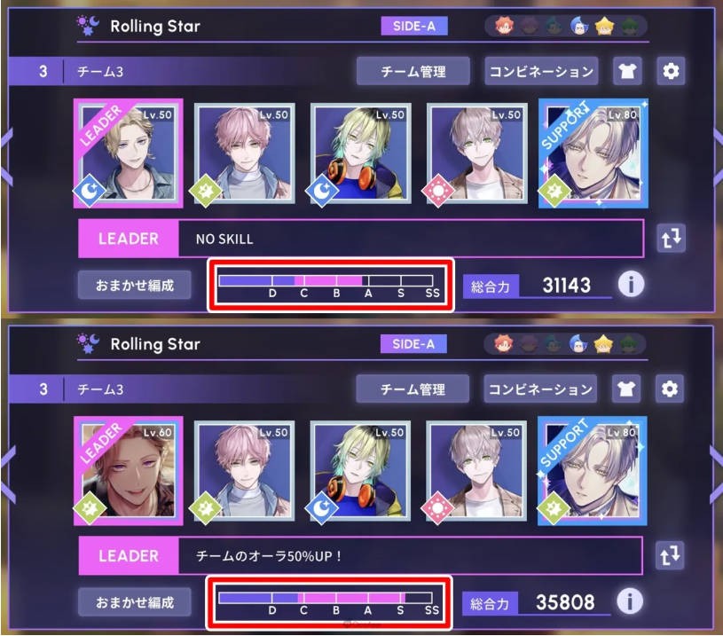 而要提高分数最单纯的方法就是卡牌稀有度和等级。先不论关卡对应属性或Support好友的卡牌能力加乘,光是全R卡凸满50等的预测分数,和含有一张60等SSR卡的预测分数就有颇大的差距。这个差距有机会靠技能或自身的Combo技术填补,只是若对Combo技术没有自信,就是用卡牌等级撑上去。