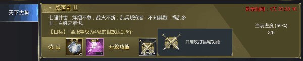 接下来君主们在特定的天下大势打开各项攻城时则需要积极参与哦!当区服天下大势完成到一定程度上时,则会给全服玩家发放一定奖励,所以说付出了才会有回报,攻下了一定城池后的世族,世族成员可以派遣一定的工匠对占领的城池建设相关的建筑,提升基础的资源产值或减少招募士兵时间或资源消耗。