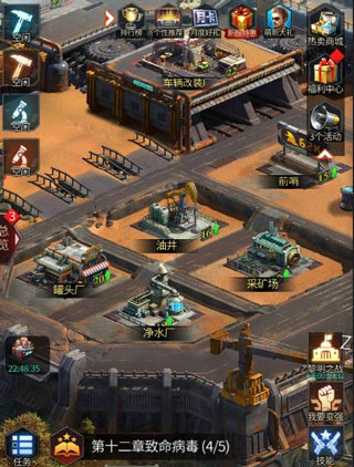 在采集队伍招募完成之后,平时玩家们可以将采集队列派出野外采集。同时我们需要建设资源类建筑和医院,保证发育。资源类建筑有罐头厂、净水厂、采石场和油井,资源类建筑最好跟随主城等级升级,这样在离线时我们也能自产资源。