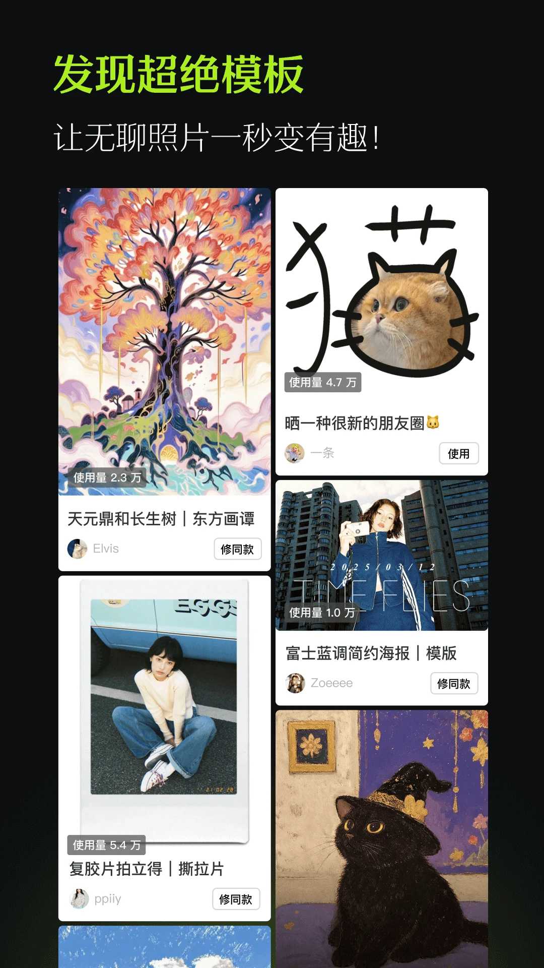 在贴纸中心,你可以随时下载最新素材。没有头绪的时候,不妨看看“推荐”中用贴纸拼贴出的作品。你还能一键下载作品中的所有贴纸,创作属于你的涂鸦动物园或网上冲浪。