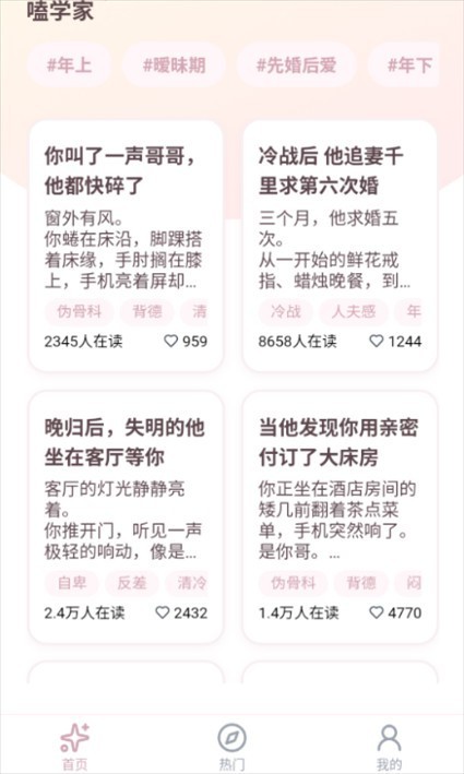 嗑学家是一款少女心满满、适合女生的免费乙女向短篇小说阅读软件,这里汇集了很多梦女的“做梦素材”,每篇故事都十分简短,方便阅读,进需要几分钟便能够让人沉浸在甜蜜或心动的情节中。你可以在这里找到任何人设的男主,比如说年上霸总、年下小狼狗、温柔治愈系腹黑系等等,嗑学家都能够满足你的任何幻想。在功能体验上,软件界面清晰,还支持免费下载短文,让用户能够随时随地打开阅读。平台每日都会更新大量高质量短篇,还有丰富的同人文内容,让你永远不会找不到东西看。