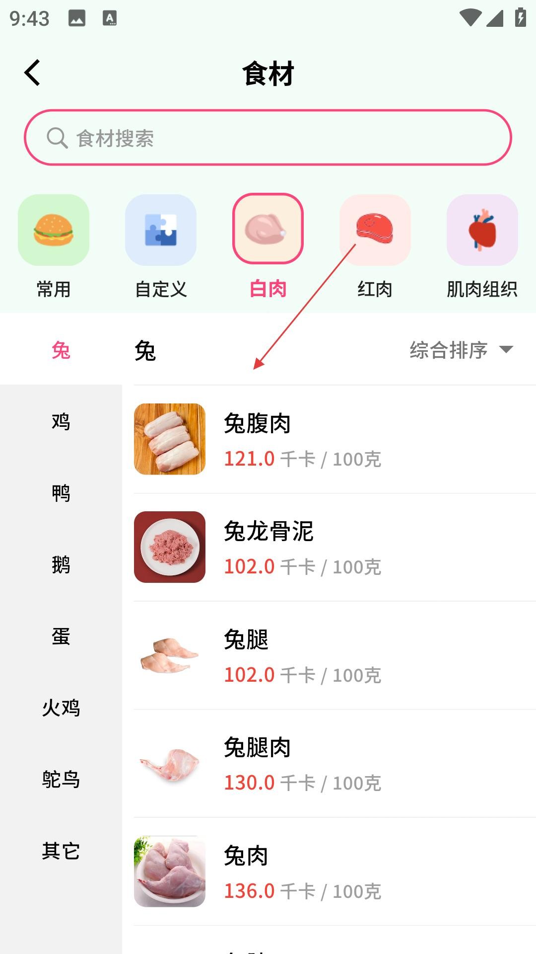 2、食材页面,能搜索食材,按白肉等分类浏览,展示兔腹肉等多种兔肉食材及热量,方便为宠物选食。