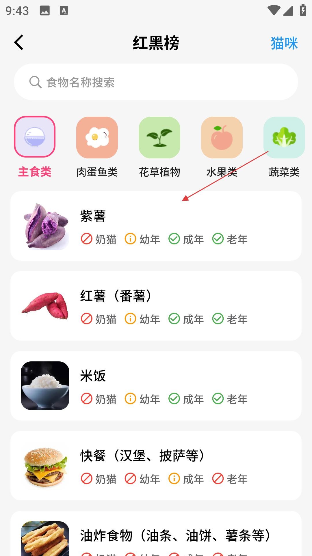 3、红黑榜页面,按主食类等分类,标注紫薯、红薯等食物对不同年龄段猫咪的适宜情况,助力科学喂养。
