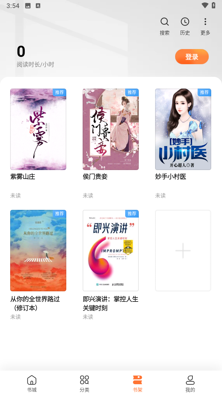 书架(如下图所示)则是存放用户阅读或购买书籍的地方,在该界面用户可以看到直自己的阅读时长和进行每日签到。也可以点击界面的右上角查找图书,点击界面的段落图标来导入本地图书和使用WIFI传书功能。