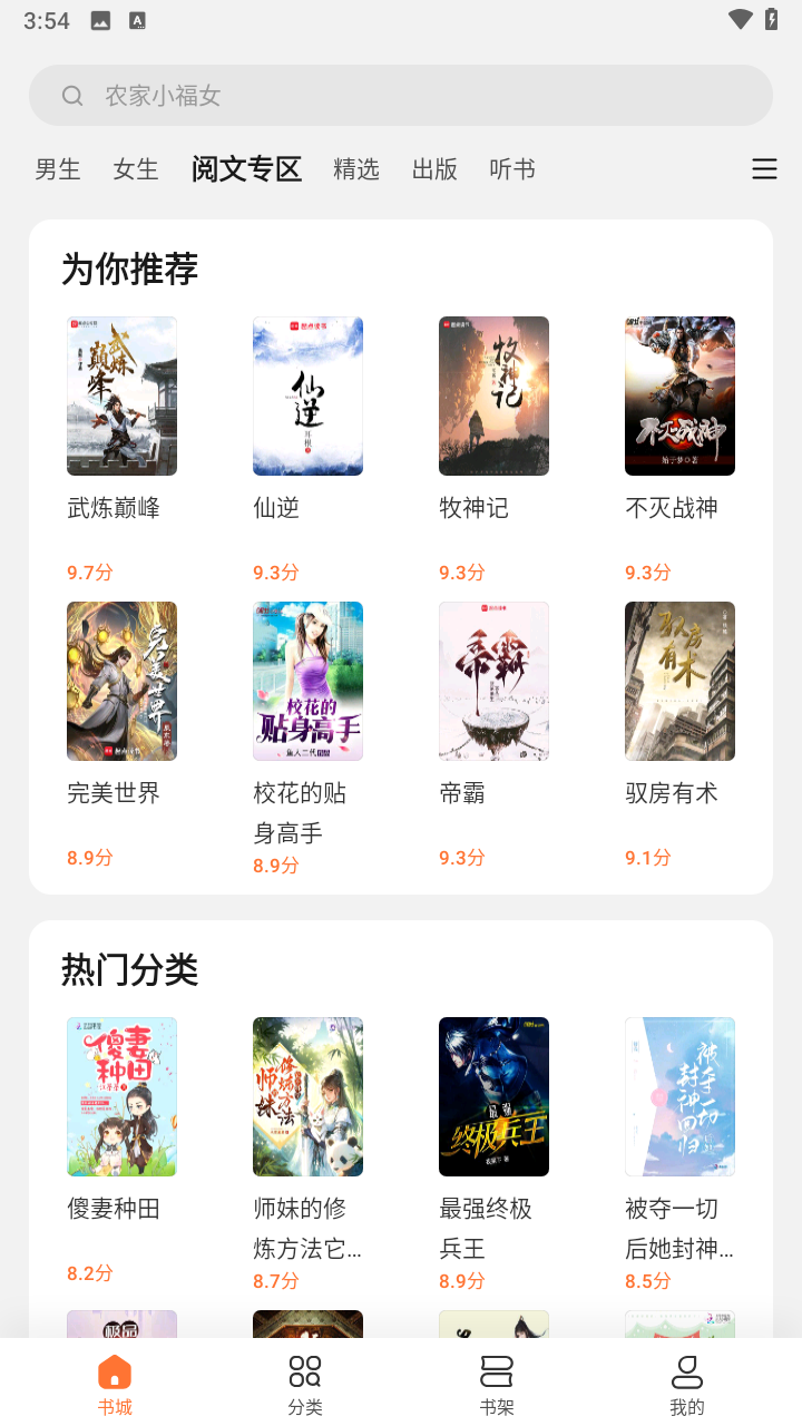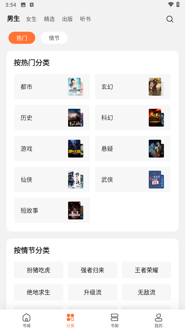 书城分为男生、女生、听书、漫画四部分,使用用户可以在书城内根据4种分类来查找适合男或女生观看的书籍、有声读物、以及漫画。用户也可以点击界面的“榜单”进行参考,筛选出感兴趣的书籍。