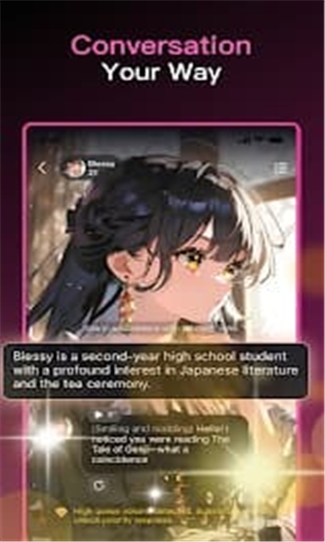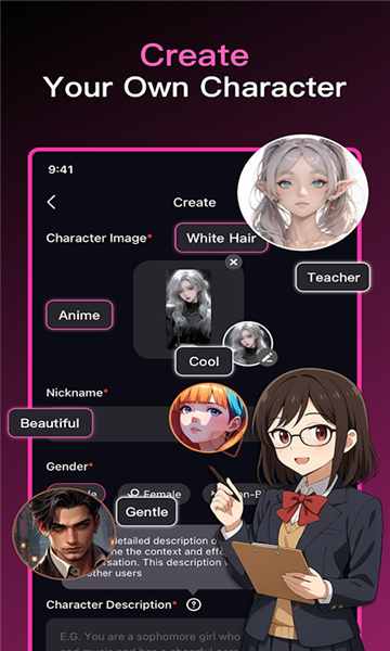 1、支持自由设定角色信息,包括人物背景、场景剧情,可创建专属恋人、伴侣等个性化AI对象;