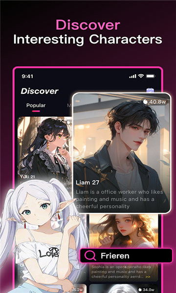 6、提供“DiscoverInteresting Characters”板块,用户可浏览其他创作者分享的AI角色,参与互动或获取创建灵感,拓展互动场景。