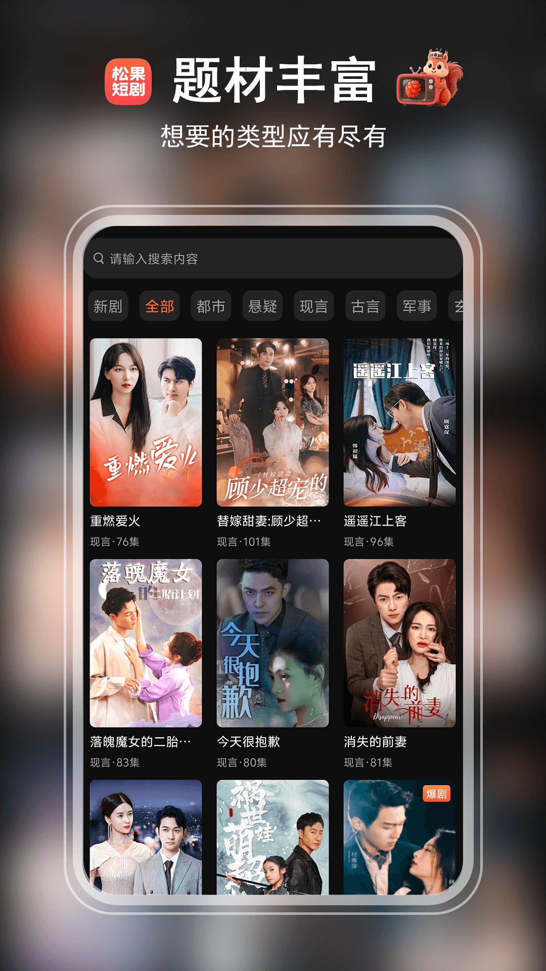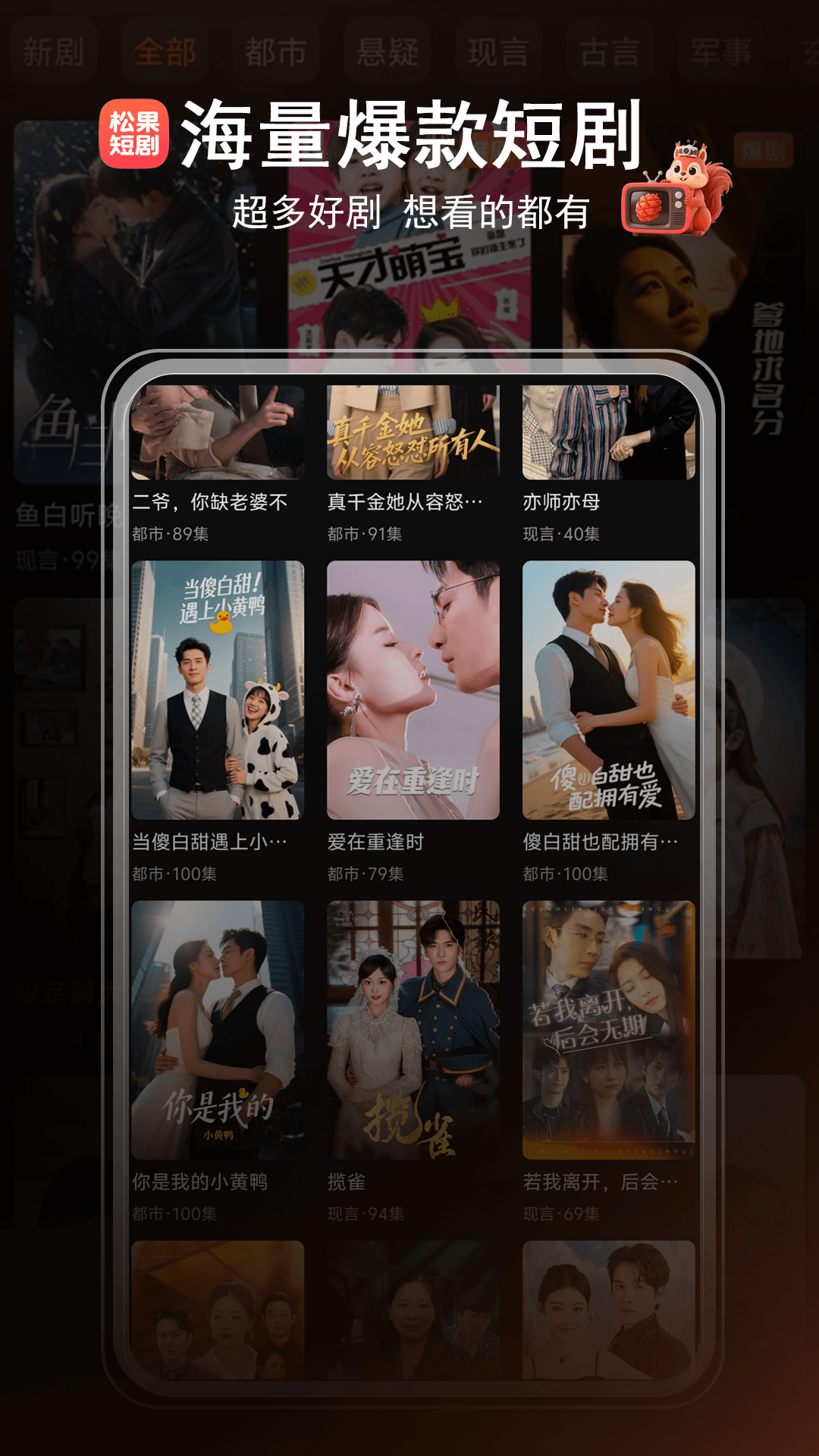 3、进入可以看到都市、悬疑、现言、古言、军事等分类已经短剧。