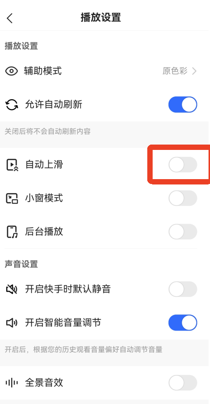 4、点击【自动上滑】右边的滑动按钮打开这个选项,打开后视频播放完毕会自动播放下一个视频。